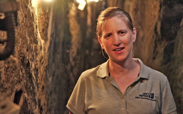 | Dr. Ayala Zilberstein, az Izraeli Régészeti Hatóság munkatársa, a jeruzsálemi Davidson Régészeti Park ásatásainak vezetője bejelenti a pecséttöredék megtalálását 2025.10.22-én. (Emil Aladjem/Israel Antiquities Authority, forrás:https://www.timesofisrael.com) |
